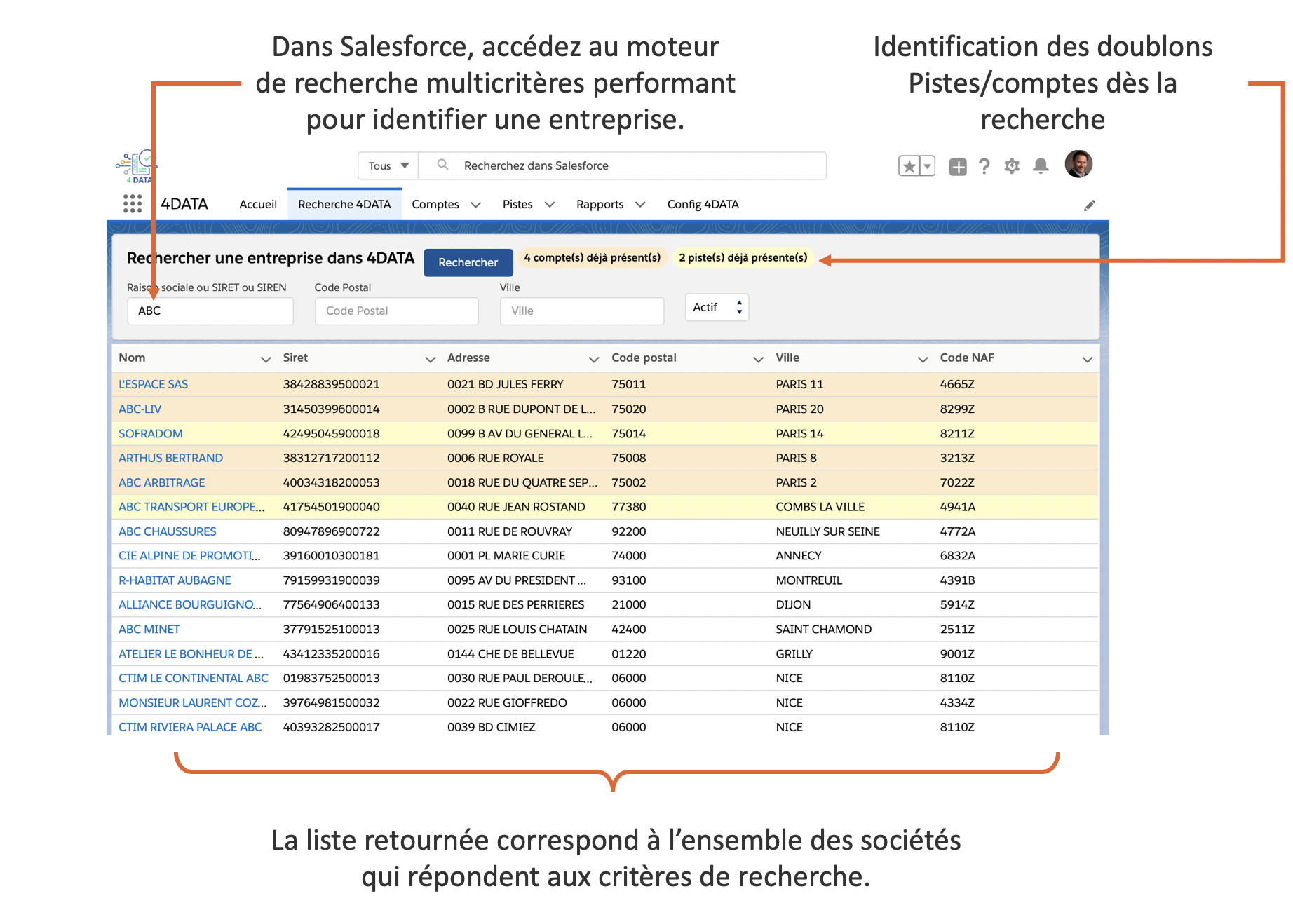 4Data vous permet d’enrichir, vérifier et mettre sous surveillance vos comptes ou pistes, tout en restant dans votre environnement Salesforce